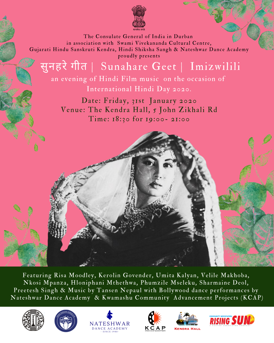 An evening of Hindi Film music on the occasion of International Hindi Day 2020. Entry is free. Passes are available for Collection at the Consulate General of India, Durban offices.