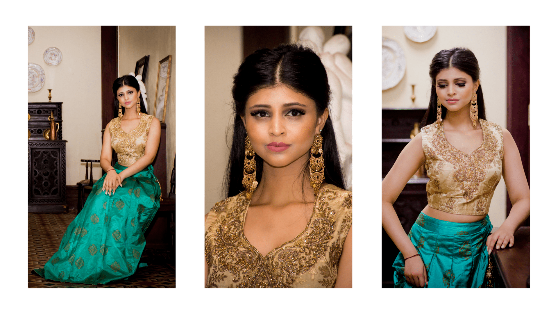 The first look presented showcases a gorgeous embossed and embellished gold blouse and a turquoise silk brocade print skirt from Raj Delhi Couture with earrings from Collete. This look illustrates youthfulness as a young woman collects and reflects upon her memories.