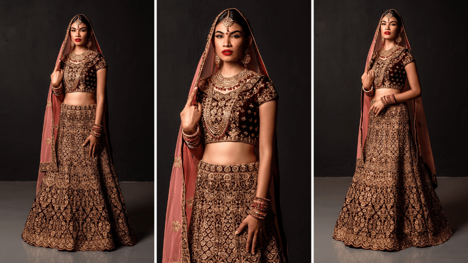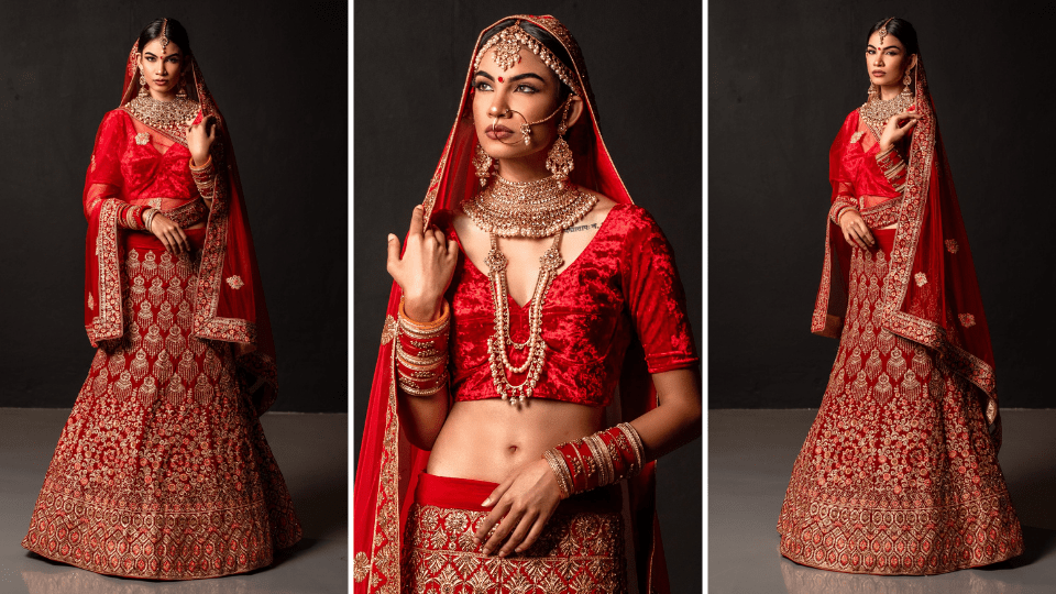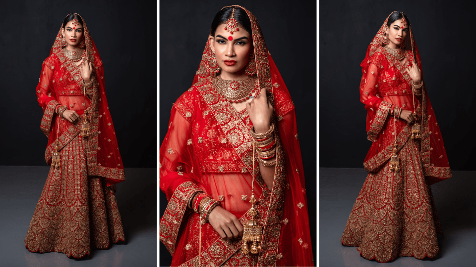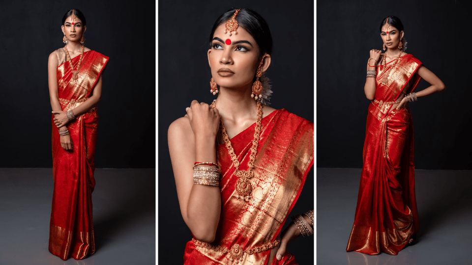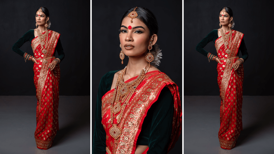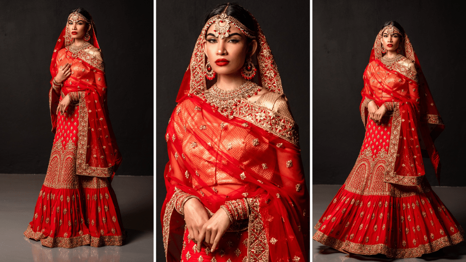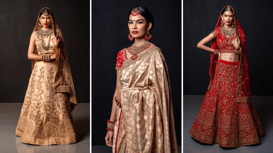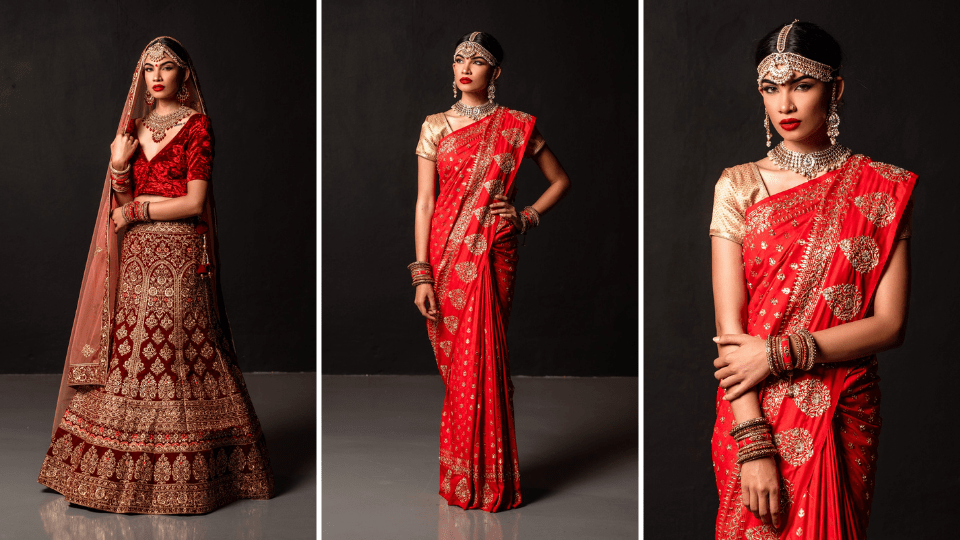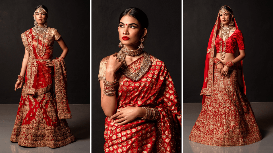 The classic Red Hues and Gold Tones will forever be a classic choice for the traditional bride. We styled these traditional looks in an array of drapings and stylings to inspire your wedding look. This gorgeous collection is available at Shringar.